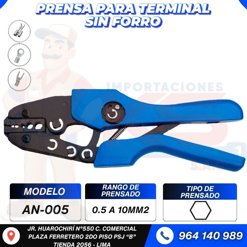 • PRENSA PARA TERMINAL SIN FORRO 0.5-10MM2 (PRENSADO HEXAGONAL) COLOR AZUL